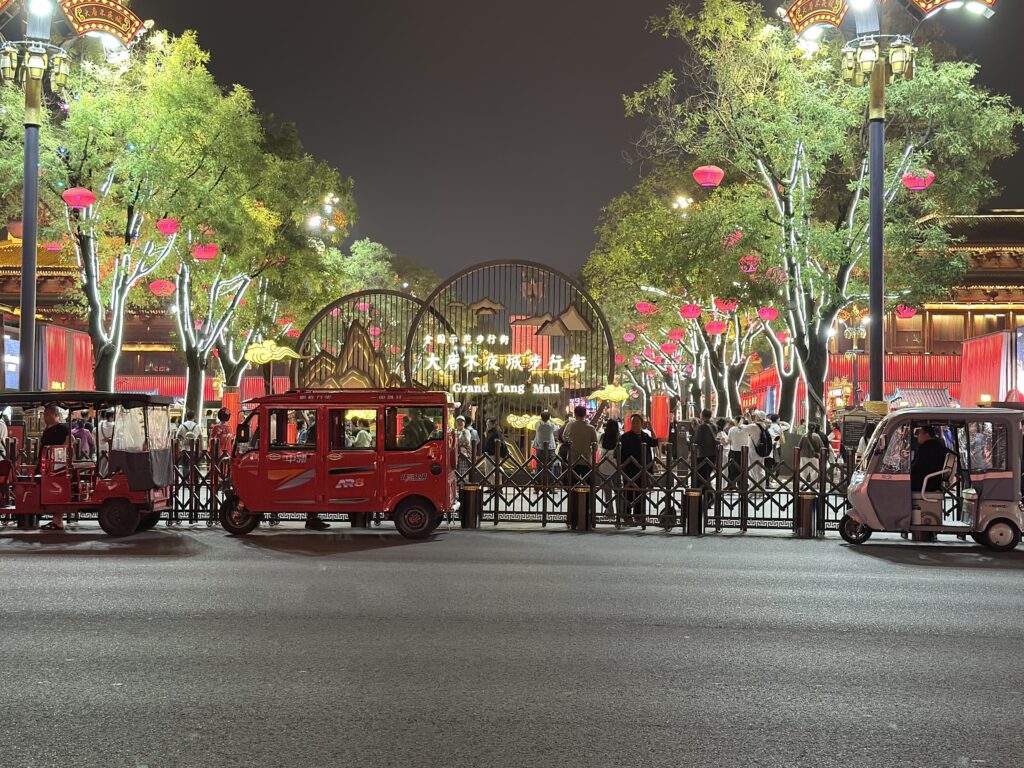 Danach stand eine optionale Tour zur Wildganspagode bei Nacht an. Eigentlich wollten wir zurück ins Hotel, doch 28 von 38 Teilnehmenden entschieden sich spontan mitzukommen – also ließen wir uns mitreißen, wir wollten wie immer ja auch nichts verpassen. Wir spazierten durch die beleuchtete Beiyuanmen-Straße. Wir bekamen 30 Minuten Zeit, um erst die eine Richtung zu erkunden und dann nochmal 45 Minuten für die andere Richtung. Nach den ersten 30 Minuten trafen wir uns in der Mitte.