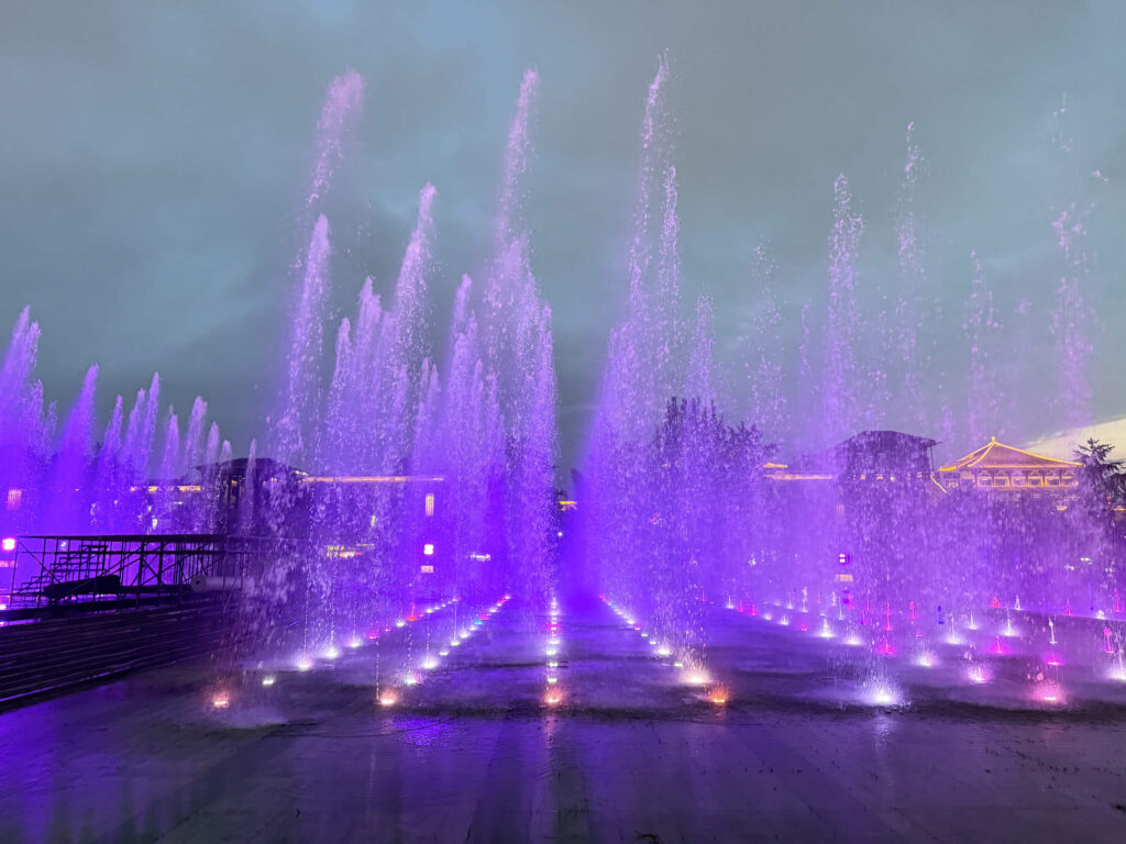 Nach dem Essen ging es weiter zu den berühmten musikalischen Wasserspielen – angeblich die größten Lichtspiele Chinas, direkt am Glockenturm. Punkt 19 Uhr begann die täglich stattfindende Show: Wasser, Licht und Musik im perfekten Takt. Wunderschön anzusehen, zehn Minuten pure Synchronität – und das Beste: kostenlos.