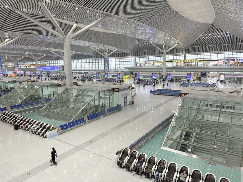 Gegen 12 Uhr sammelte sich die Gruppe wieder, und es ging zurück in den Bus – weiter zum Bahnhof. Der Bahnhof war riesig wie ein Flughafen, mit einer gewaltigen Halle und Anzeigetafeln nur auf Chinesisch. Zum Glück war alles perfekt organisiert. Wir mussten uns nur die Abfahrtszeit merken.