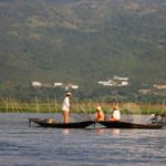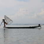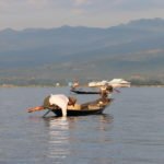 In den grüngestrichenen eisernen Stühlen des Bootes saßen wir trotz der Kissen etwas unbequem. Mit vollem Tempo krachte das Longtailboot (Langheckboot) im wahrsten Sinne des Wortes den Kanal zum Inle-See entlang. Gleich am Anfang des Sees konnten wir auch schon die Einbeinruderer beim Fischen beobachten. Diese einzigartige Technik des Fischfangs ist das typische Postkartenmotiv für die Region rund um den Inle-See und durfte auch in unserer Postkartensammlung nicht fehlen.