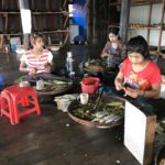 Nur eine Wasserstraße weiter lud der Bootsfahrer uns wieder ab. So langsam hatten wir den teuflischen Plan durchschaut. Station für Station werden hier die Touristen durch die unterschiedlichen Verkaufsveranstaltungen geschickt. Dabei nahmen die Vorführungen des Herstellungsprozesses qualitativ erheblich ab. Als nächstes stand eine Zigarrenmanufaktur auf dem Plan. Auf dem Boden saßen Frauen, die Zigarren in unterschiedlichen Geschmacksrichtungen rollten. Wir ließen es uns nicht nehmen und probierten jeder eine Zigarre. Zwei unterschiedliche Geschmacksrichtungen gab es im Angebot: klassisch und eine süße Variante, die gar nicht weiter nach einer Zigarre schmeckte und dem süßen Geschmack einer e-Zigarette ähnelte. Änn erwarb ein kleines Kästchen mit diesen Glühstengeln zur Erinnerung.