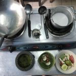 Als alle Zutaten im Beutel gepackt waren, ging es dann endlich Richtung Küche. In einer Seitenstraße befand sich ein offener Raum mit vier doppelten Herdplatten, einem großen Tisch, Waschbecken und Kühlschrank. Eine offene Küche, unser heutiger Klassenraum.