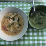 Wir verbrachten den ersten Advent bei 32 Grad Außentemperatur in einer thailändischen Küche und lernten fleißig einheimische kulinarische Köstlichkeiten zubereiten. Schürzen an und Messer hoch. Insgesamt waren wir vier Kochlehrlinge. Zwei Damen aus Korea, unsere Kochlehrkraft und Änn & Fränn. Diesmal war alles anders, die Köchin war sehr streng zu uns und achtete dringlichst darauf, dass wir ihren Anweisungen folgten. Fränn Konzentration ließ wegen der Erkältung zu wünschen übrig. Einmal nicht aufgepasst, gab es gleich eine Abmahnung und böse Blicke der kochenden Lehrperson. Die strenge thailändische Dame setzte viel voraus und scheute es nicht uns so oft es nur geht zu ermahnen. Als Einstieg kochten wir Tom Yum Kung, eine klassische thailändische Suppe. Mit der Zubereitung der Paste für ein grünes Curry ging es weiter. Die Mörserarbeiten zwangen uns an unsere Armkraftgrenzen. Letztendlich bewältigten wir auch diese Aufgabe und schafften so die Grundlage für ein leckeres Green Curry.