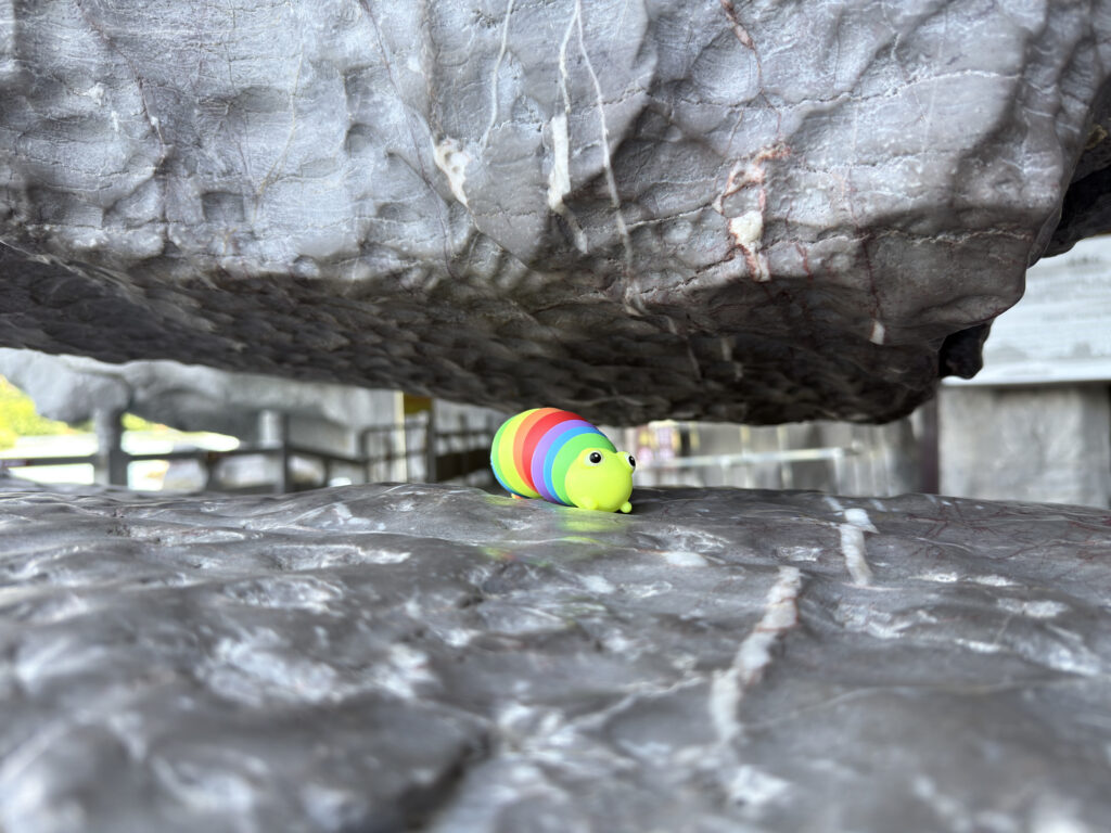 An der Flussseite entdeckt man schließlich eine besondere Steinformation: einen massiven Felsblock, der nur wenige Zentimeter über dem Boden zu schweben scheint.