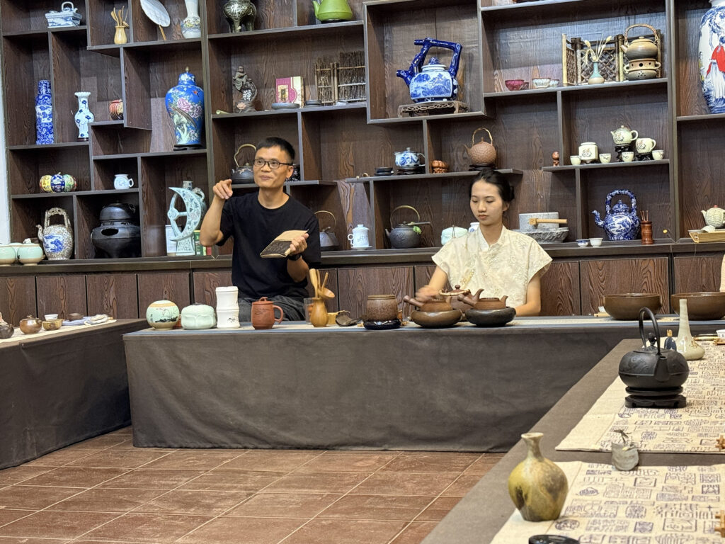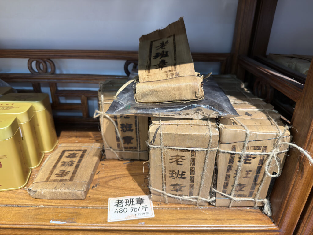 Der Besitzer, charmant und redegewandt, präsentierte uns verschiedene Jahrgänge schwarzen Tees. Mariana war sofort begeistert, Fränn blieb skeptisch – bis zur Kostprobe. Wir saßen an einem kleinen Holztisch, tranken Tee aus dem Jahr 2008 und mussten kaum verhandeln – der Verkäufer wusste längst, dass wir aus Deutschland kamen und ein festes Budget hatten. Am Ende kauften wir zwei Packungen für 400 Yuan (ca. 50 €). Angeblich reicht eine davon ein halbes Jahr, da man den Tee bis zu zehnmal aufgießen kann.