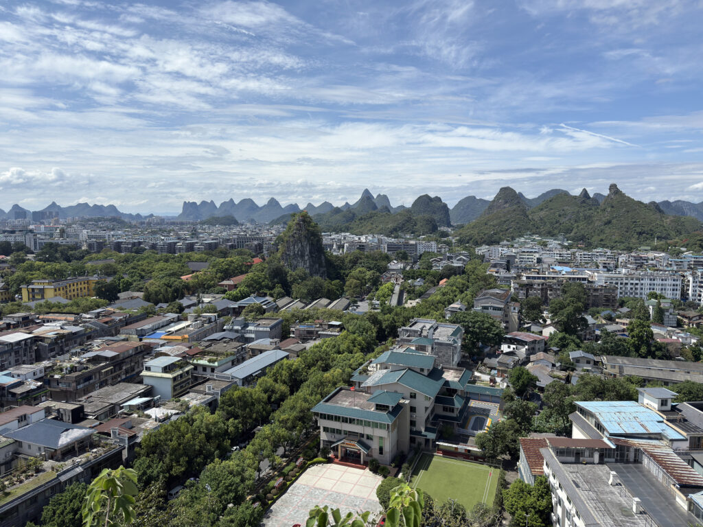 Nach einer weiteren Etappe erreichten wir Guilin. Unser erster Stopp: der Fubo-Hügel, direkt am Li-Fluss gelegen. Mit seinen 63 Metern Höhe ist er leicht zu besteigen – die Stufen sind allerdings schmal und führen steil hinauf und wieder hinab.