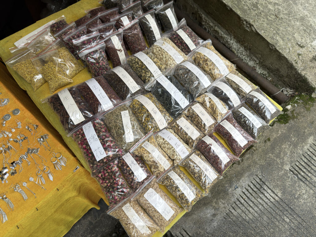 Auf dem Weg zur Busstation hielten wir noch an ein paar kleinen Ständen: Osmanthusblüten, ein Glücksbringer für Diana und – natürlich – wieder Tee. Wir wussten zwar nicht genau, was wir da kauften, aber die Verkäuferin erklärte uns begeistert die Wirkung. Also: gekauft. Tee kann man schließlich nie genug haben.