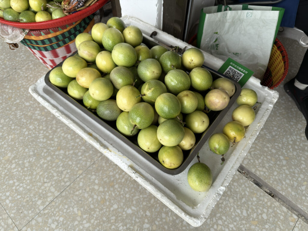 An der Busstation kam Fränns Verhandlungstalent wieder zum Einsatz. Gong hatte erwähnt, dass Passionsfrüchte hier 1 Yuan kosten – Tourist:innen zahlen meist das Doppelte. Fränn blieb hartnäckig, handelte wie eine Profi-Marktfrau – und bekam am Ende eine Tüte voller Früchte zum echten Local-Preis.