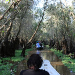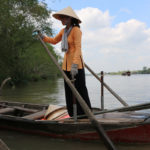 Anschließend verließen wir unser motorisiertes Boot für eine Kanaltour. Die typisch vietnamesische Ruderin, die unser Sampan sicher durch die schmalen Wasserwege führte, sah genauso aus wie die Frauen auf den unzähligen Touristenmagneten, die es überall zu kaufen gab.